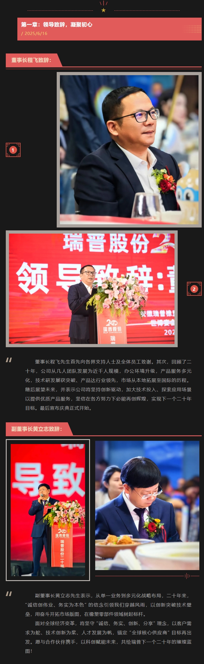 二十載櫛風(fēng)沐雨,二十載砥礪前行。值此安徽瑞普橡塑科技股份有限公司成立二十周年之際,我們滿懷感恩與喜悅,誠(chéng)邀您撥冗出席二十周年慶典活動(dòng),共同見證這一榮耀時(shí)刻,共敘情誼,共謀未來!